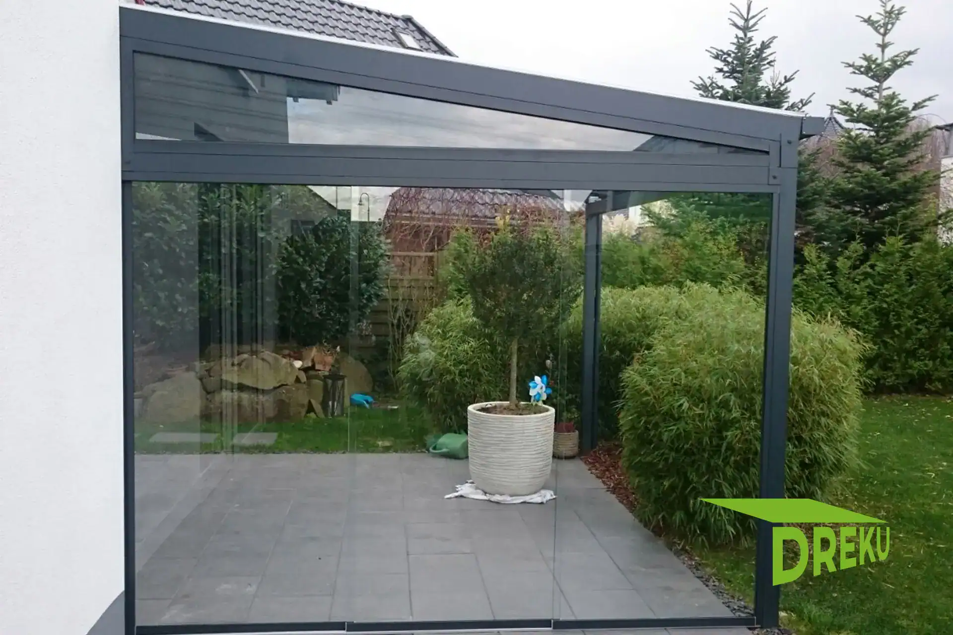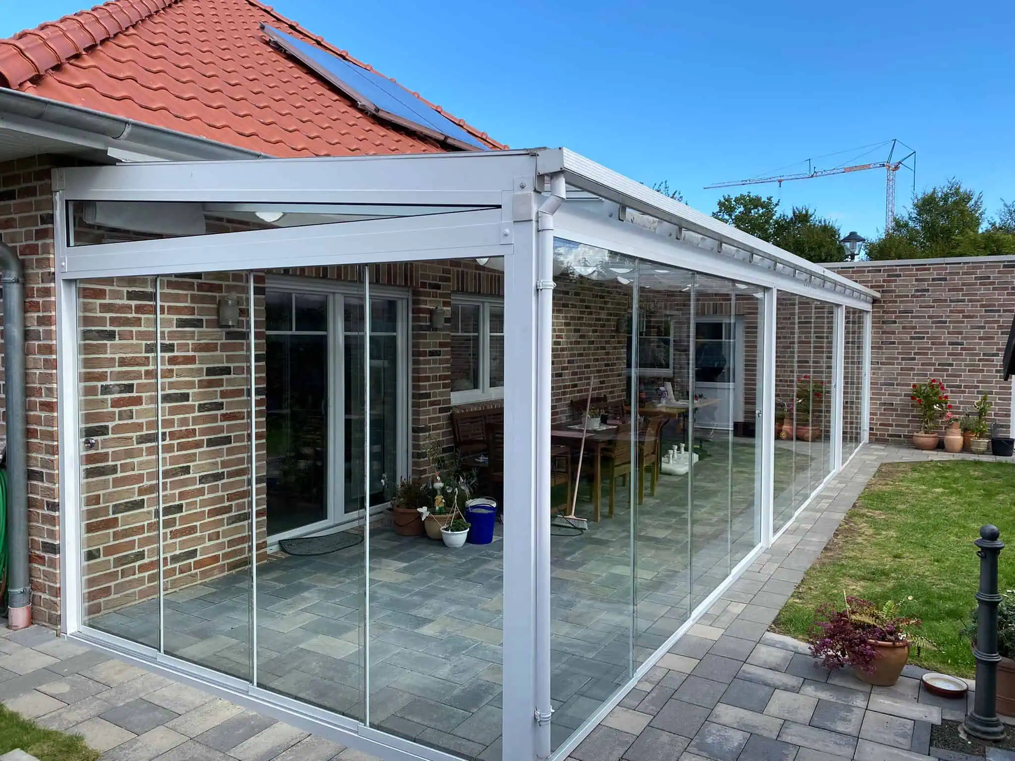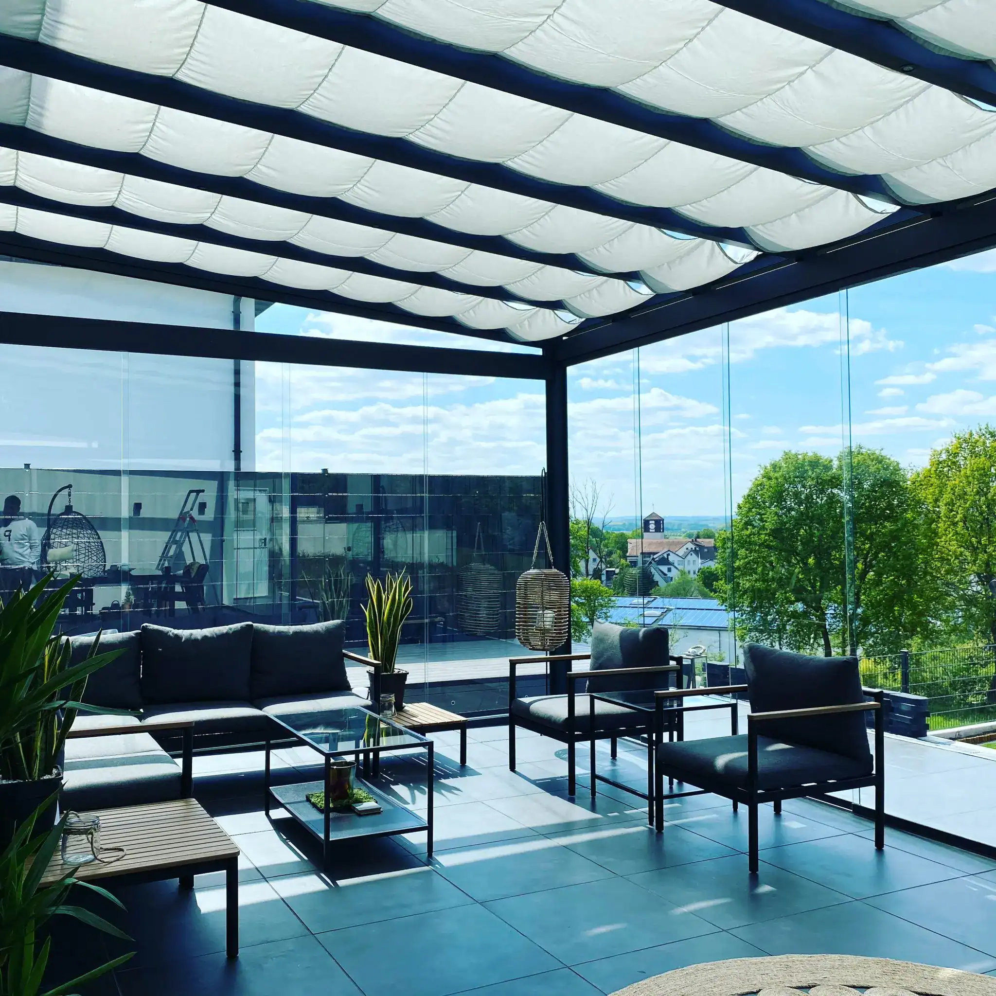 - Glasschiebewände oder Feste Seitenverglasungen für die Schließung der Seiten