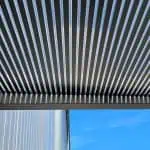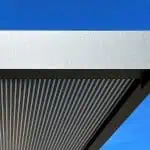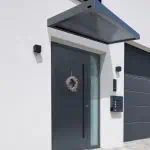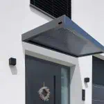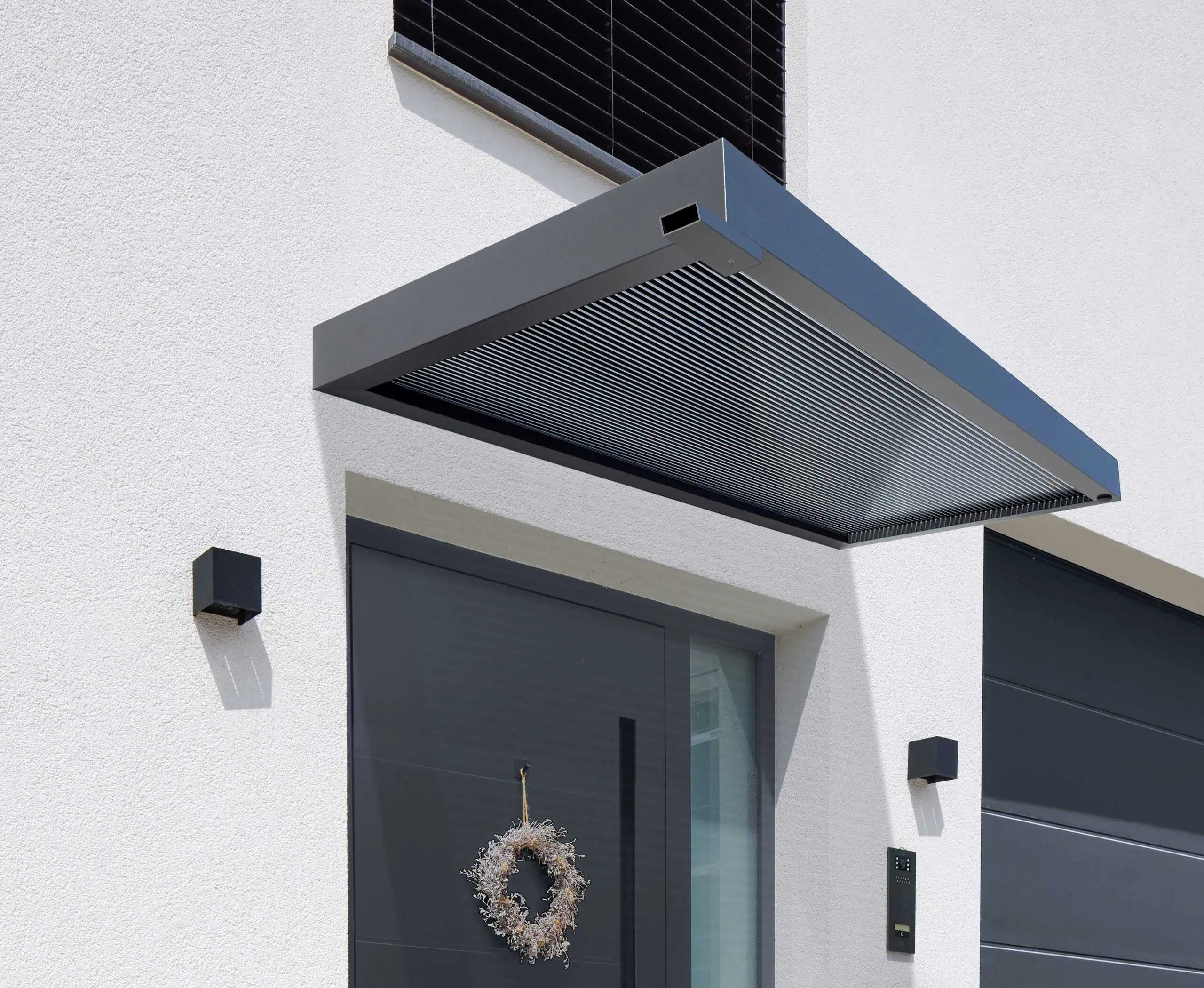 Das neue Vordach verfügt über ein schlichtes kubisches Design aus einer langlebigen Aluminium-Konstruktion, die mit einer Pulverbeschichtung mit matter Feinstruktur versehen ist. Die besondere Raffinesse besteht in der Abdeckung, bei der eine 16 mm starke „Zebraplatte“ zum Einsatz kommt. Die klare Polycarbonat-Stegplatte verfügt über dunkle Längsstreifen, die einen außergewöhnlichen 3D-Effekt kreieren. Sie hält Wind und Wetter zuverlässig fern und kann an heißen Tagen sogar wohltuenden Schatten spenden, wobei sie weiterhin ausreichend Licht hindurchlässt. Eine integrierte Entwässerung verhindert die Ansammlung von Regenwasser.