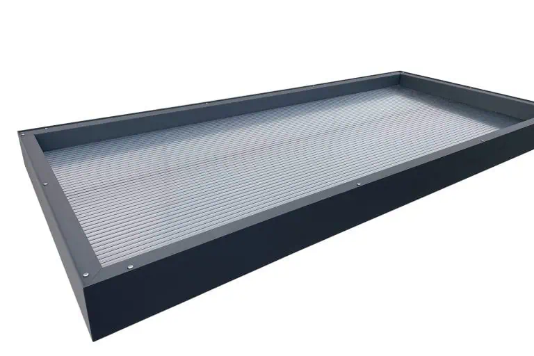 – Abdeckung mit 16 mm starker “Zebraplatte” (hagelsichere PC-Stegplatte mit dunklen Streifen)